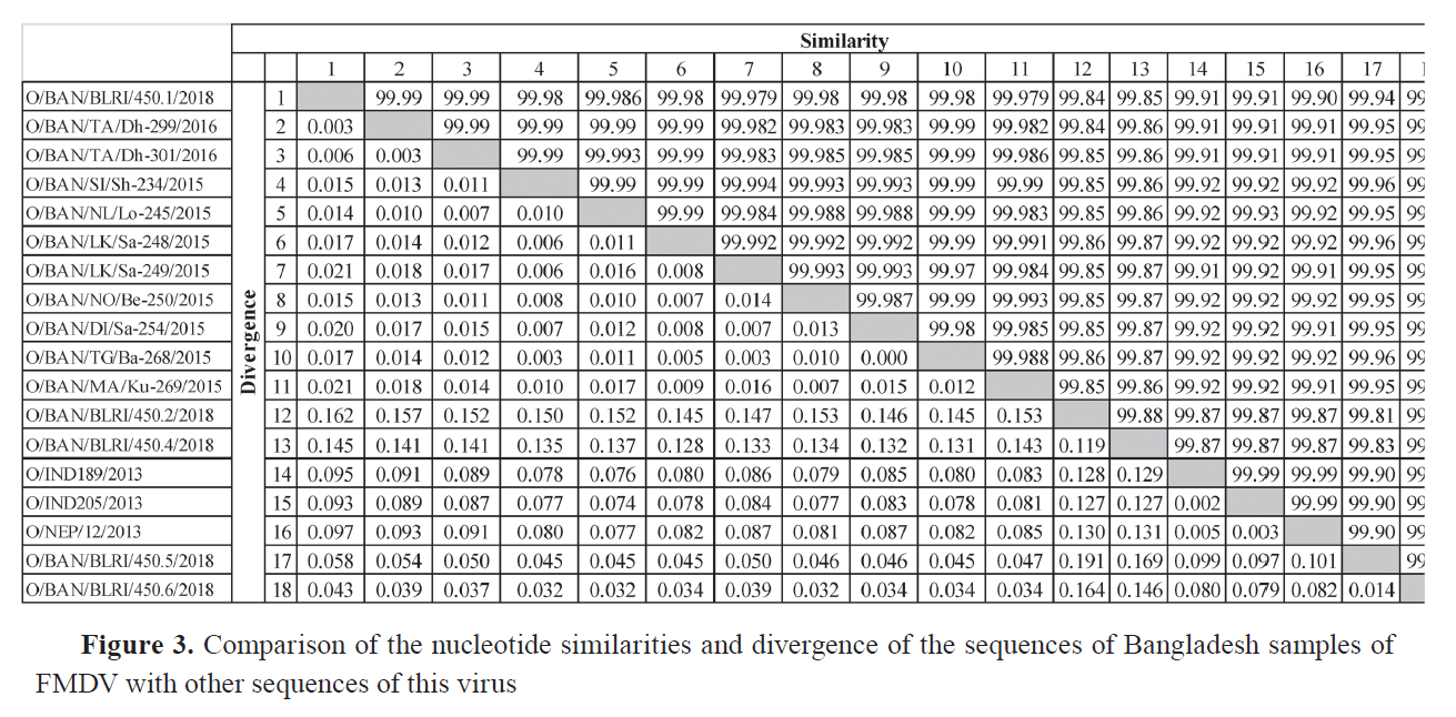 DISCUSSIONFMD affects all cloven hoof animal species in Bangladesh every year, especially cattle and buffalo. It has been reported that the genetic evolution of FMDV leads to consistently increasing tendency of infection and mortality (