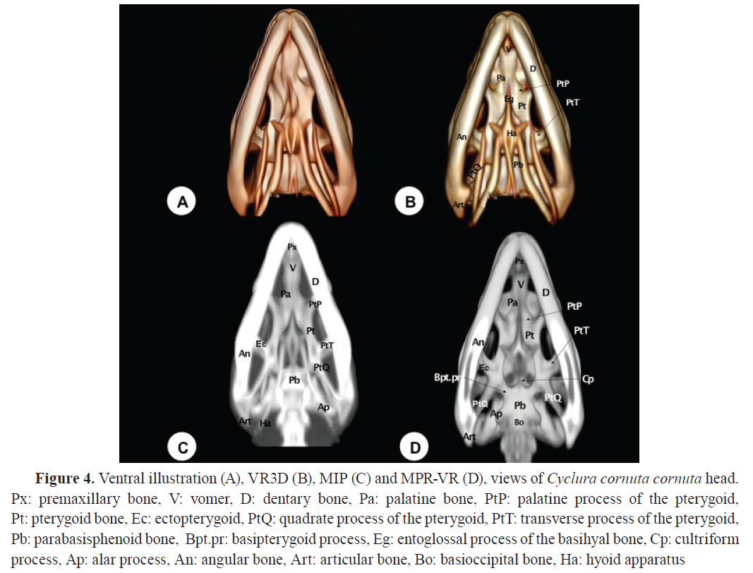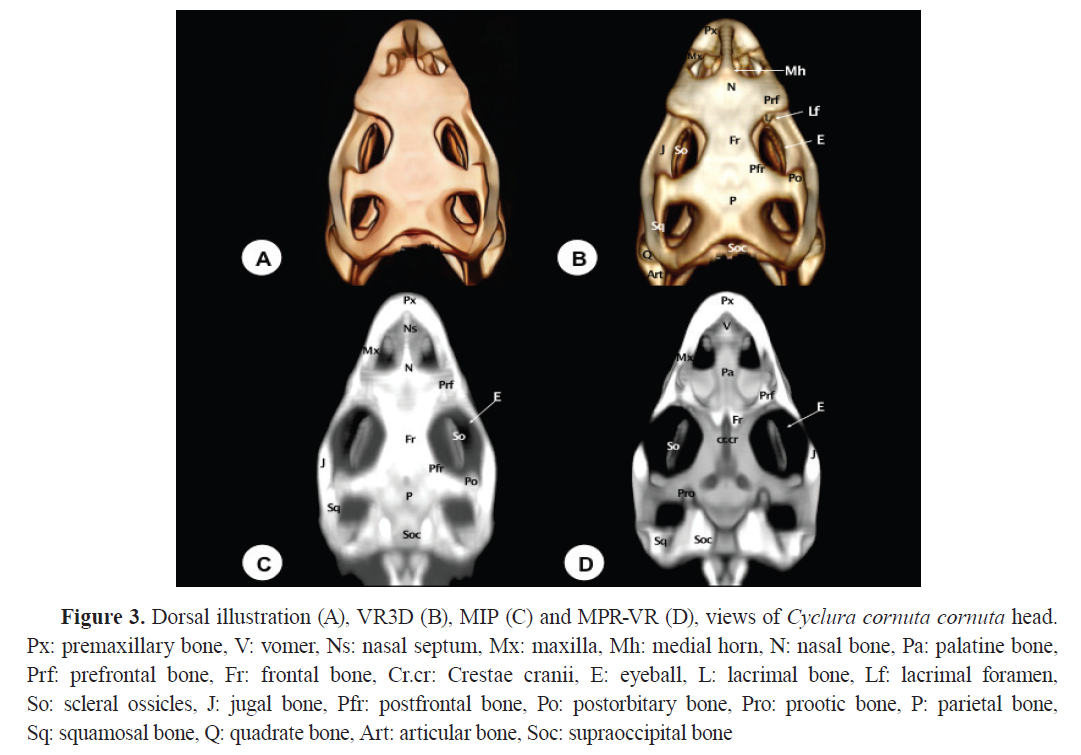 Therefore, the combination of different CT reconstruction techniques (VR3D, MIP, MPR-VR) was pivotal for the anatomical description of the rhinoceros iguana skull, useful for clinical purposes detecting fractures, abscesses, and metabolic bone disease in iguanas in rescue programs and zoos and as a teaching tool of comparative anatomy in veterinary schools (