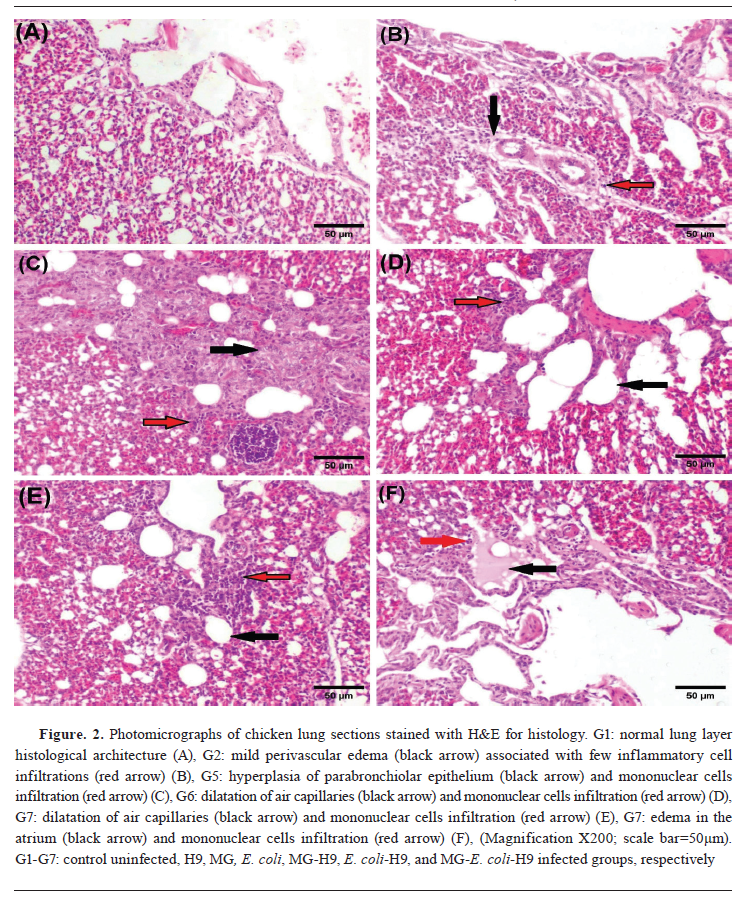 E. coli-H9 group indicated a higher severity in the congestion, edema, mononuclear cell infiltration of both trachea and lung, as well as hyperplasia of parabronchiolar epithelium with dilatation of air capillaries in the lung. These histopathological findings were supported by WU outcomes, which indicated more severe inflammatory injury in case of MG and