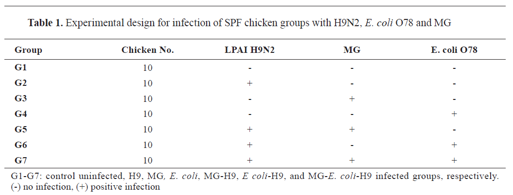 8 CFU/ml) I/T at 21 days of age. The last three groups received mixed infections using the same doses, routes, and timings as the positive control groups as follows: group 5 (G5) (MG-H9) was infected with MG and H9N2, group 6 (G6) (