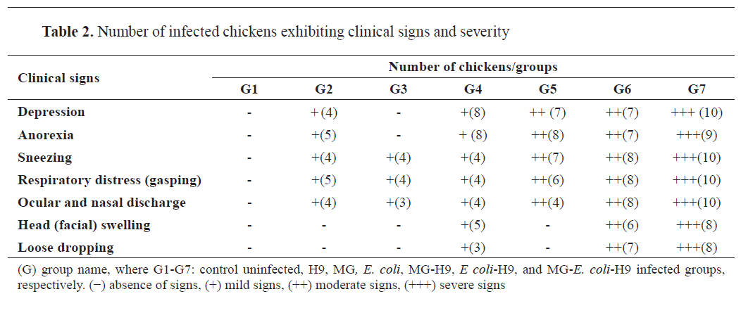 E. coli-H9 group developed the highest disease severity due to synergistic effect of both pathogens on the pathogenesis of the virus. MG-
