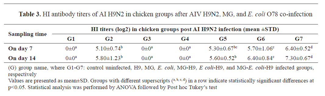 E. coli and H9N2 (G6) (5.70±1.06, 6.40±0.84 log2), but they were almost identical to those of the group co-infected with MG and H9N2 (G5) (5.30±0.67, 5.60±0.52 log2), respectively. However, HI titers were considerably higher in the G7 group, which was co-infected with