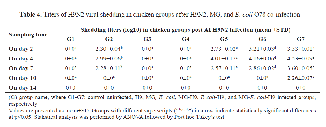 E. coli-H9 group had the highest HI titers, viral shedding titers, with significant differences, and it had also the most prolonged viral shedding period (10 dpi) indicating an increased viral replication and pathogenicity due to co-infection. The HI seroconversion and viral shedding results are in agreement with previous studies that emphasize the pathologic synergism between viral and bacterial co-infections (