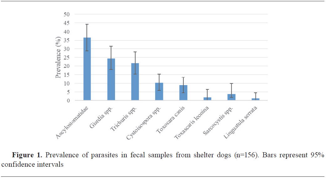 Giardia spp. (2.56%, 4/156); Ancylostomatidae with
