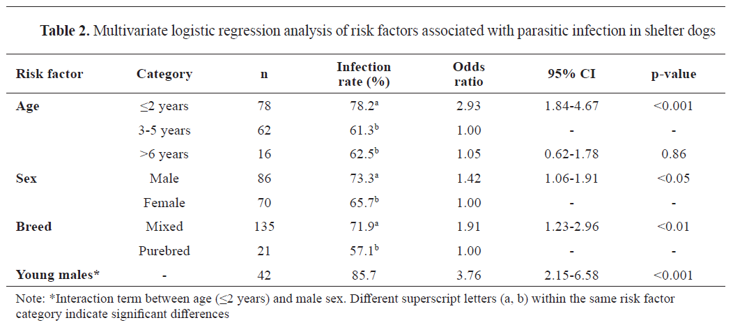 Table 2). Age emerged as the strongest predictor, with young dogs (≤2 years) showing significantly higher infection rates compared to middle-aged dogs (OR=2.93, 95% CI: 1.84%-4.67%, p<0.001).