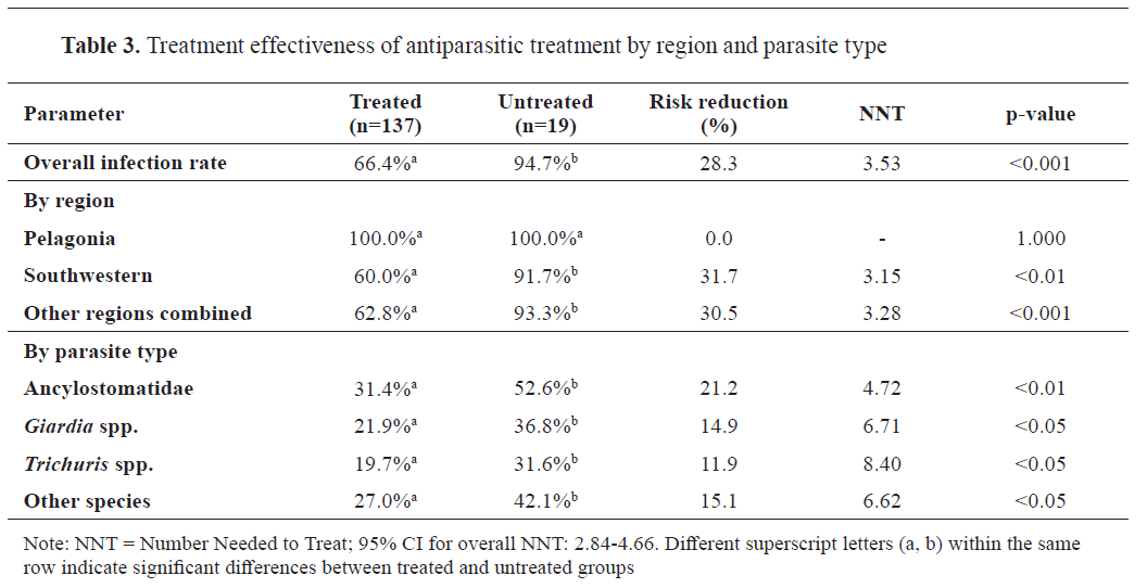 The significant reduction in infection rates among treated dogs (28.32% risk reduction) demonstrates the effectiveness of antiparasitic treatment programs. However, the variation in treatment coverage across regions highlights implementation challenges that need to be addressed.