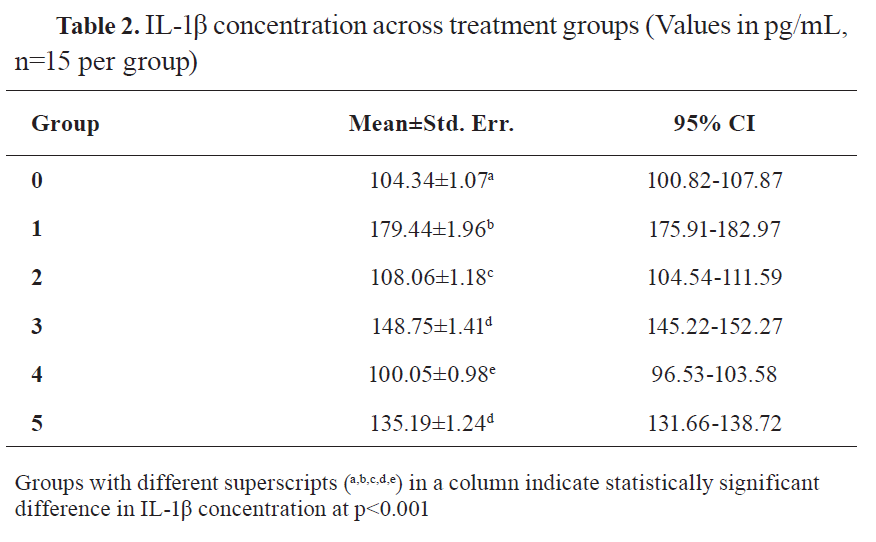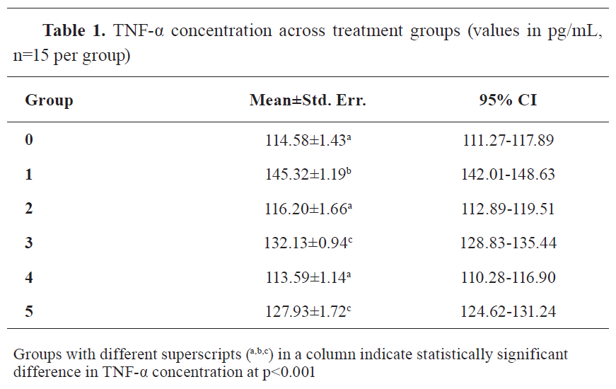 Statistical analyses were performed using Statistica 7.1 software (StatSoft Inc., USA). Descriptive statistics included mean, standard deviation, and 95% confidence intervals. Intergroup comparisons of TNF-α and IL-1β levels across treatment groups and time points were performed using one-way ANOVA followed by LSD post-hoc tests. A p-value of <0.001 was considered statistically significant.