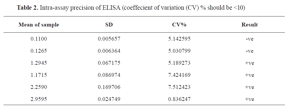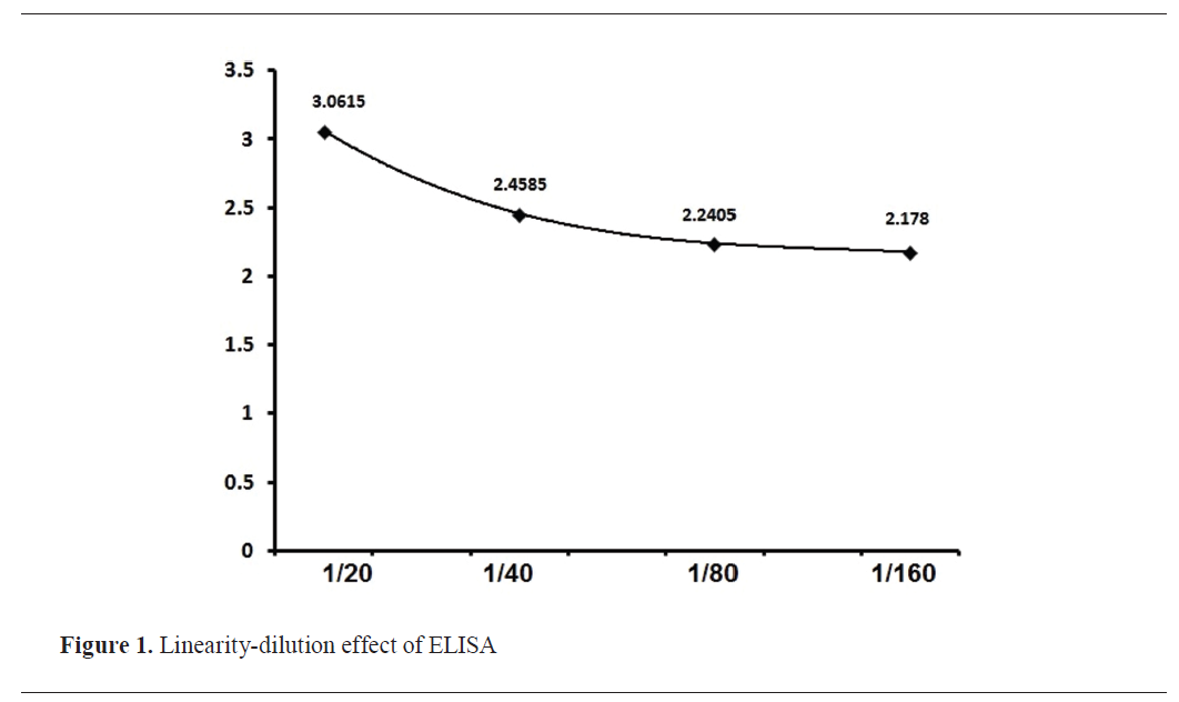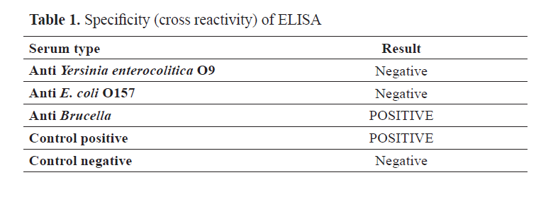 Validation of ELISA was done by measuring Linearity, Specificity (cross-reactivity) using serum against gram-negative bacteria that cross-reacted with serological tests for diagnosis of brucellosis, Sensitivity and Intra-assay precision.