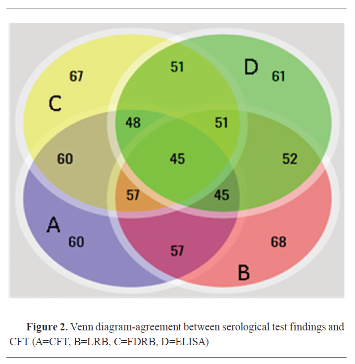 Fig. 2) expressed in detail the agreement of positive results among CFT, LRB, FDRB, and ELISA. There was no positive case detected by CFT. Both RB antigens detected 4 positive cases, single positive case was detected by LRB and ELISA, and 3 positive cases were detected by ELISA. While A Venn diagram (