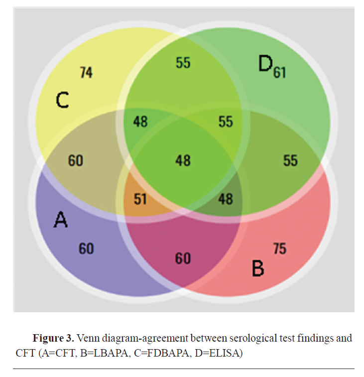 Fig. 3) expressed in detail the agreement of positive results among CFT, LBAPA, FDBAPA, and ELISA.
