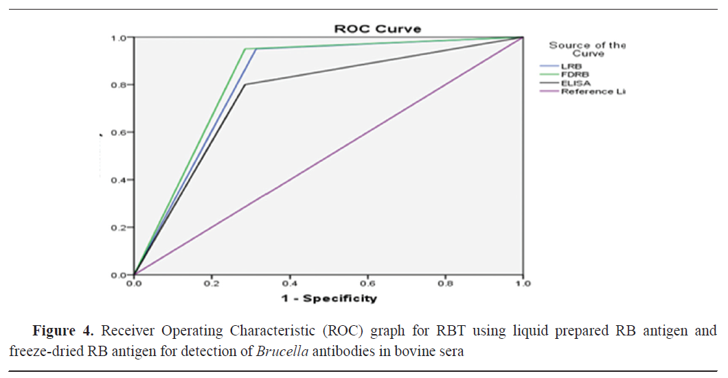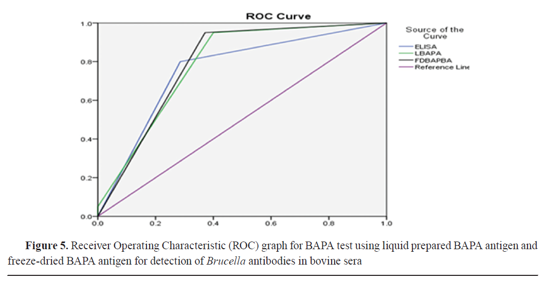 The ROC curve showed similar specificity and sensitivity as the in-house prepared antigens and the ELISA assay by using the cut-off points with consideration of CFT as the gold standard. The AUC analysis of all slide agglutination tests and I-ELISA ranged between 75.7 and 83.2%. The highest AUROC values were for FDRB, which indicated its good efficiency in the diagnosis of brucellosis, while the lowest AUROC was for I-ELISA. Тhe AUROC values for LRB, FDBAPA, and LBAPA were 81.8, 78.9, and 78.5%, respectively. Based on the ROC curve, the difference between the two rose Bengal and the two BAPA antigens was 0.014 and 0.004, respectively. These differences were non- significant. Rose Bengal had higher accuracy than BAPA and ELISA.