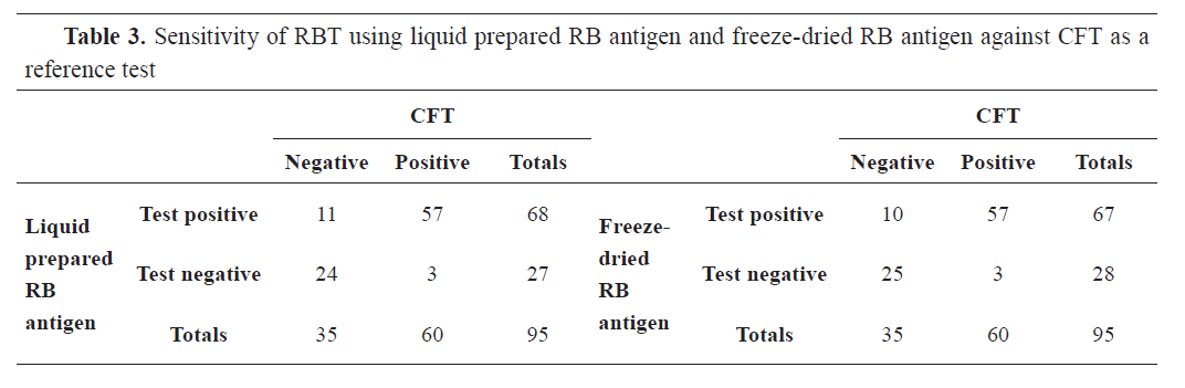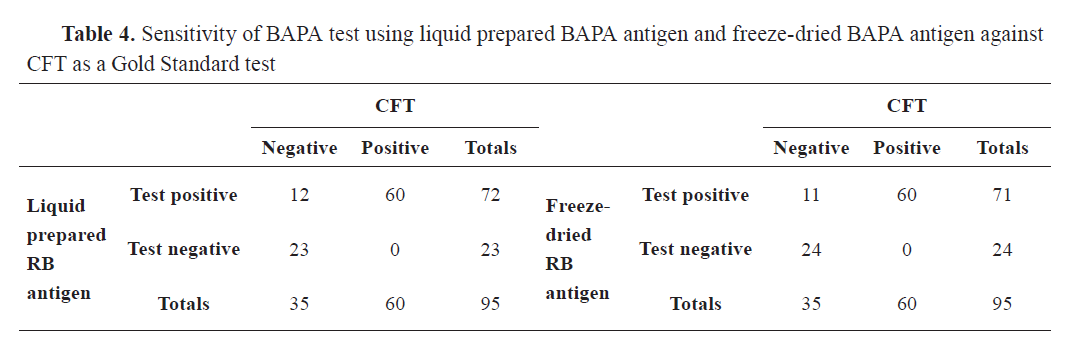 18) with no evidence of increased moisture content. This stability was observed 5 months post-production. Lyophilized antigens showed good solubility in acidic (lactic acid) diluent under negative pressure (vacuum) observed throughout longer period. The intensity of the red and blue color stains of rose Bengal and BAPA antigens was stable and suitable for the test. Also, the PCV after reconstitution of the recommended volume of diluents was about 8% and 11% for RB and BAPA antigens, respectively. There was no autoagglutination observed between the control and field