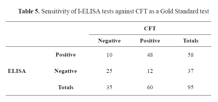 The reactors’ agreement with the reference test (CFT) was 57 (60%) for LRB and FDRB, 60 (63.16%) for LBAPA and FDBAPA, and 73 (76.84%) for I-ELISA (