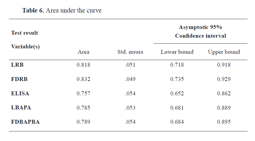 AUROC values were 0.818, 0.832, 0.757, 0.785, and 0.789 for LRB, FDRB, ELISA, LBAPA, and FDBAPBA, respectively (