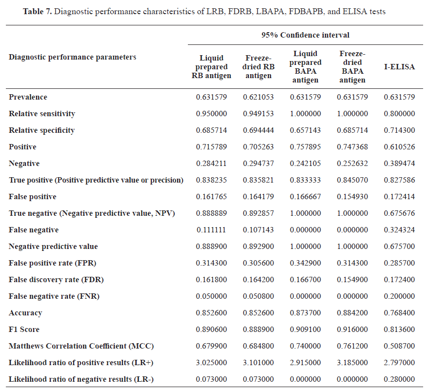 Anyhow, I-ELISA showed the highest percentage of false positive, false negatives and false discovery rate of false negative rates, which had a negative impact on the accuracy of diagnostic results, while the others had a positive impact and increased sensitivity and specificity of these tests with more accurate results. Results revealed that freeze-dried and liquid-prepared antigens were with approximately the same diagnostic performance characteristics and showed no significant difference.